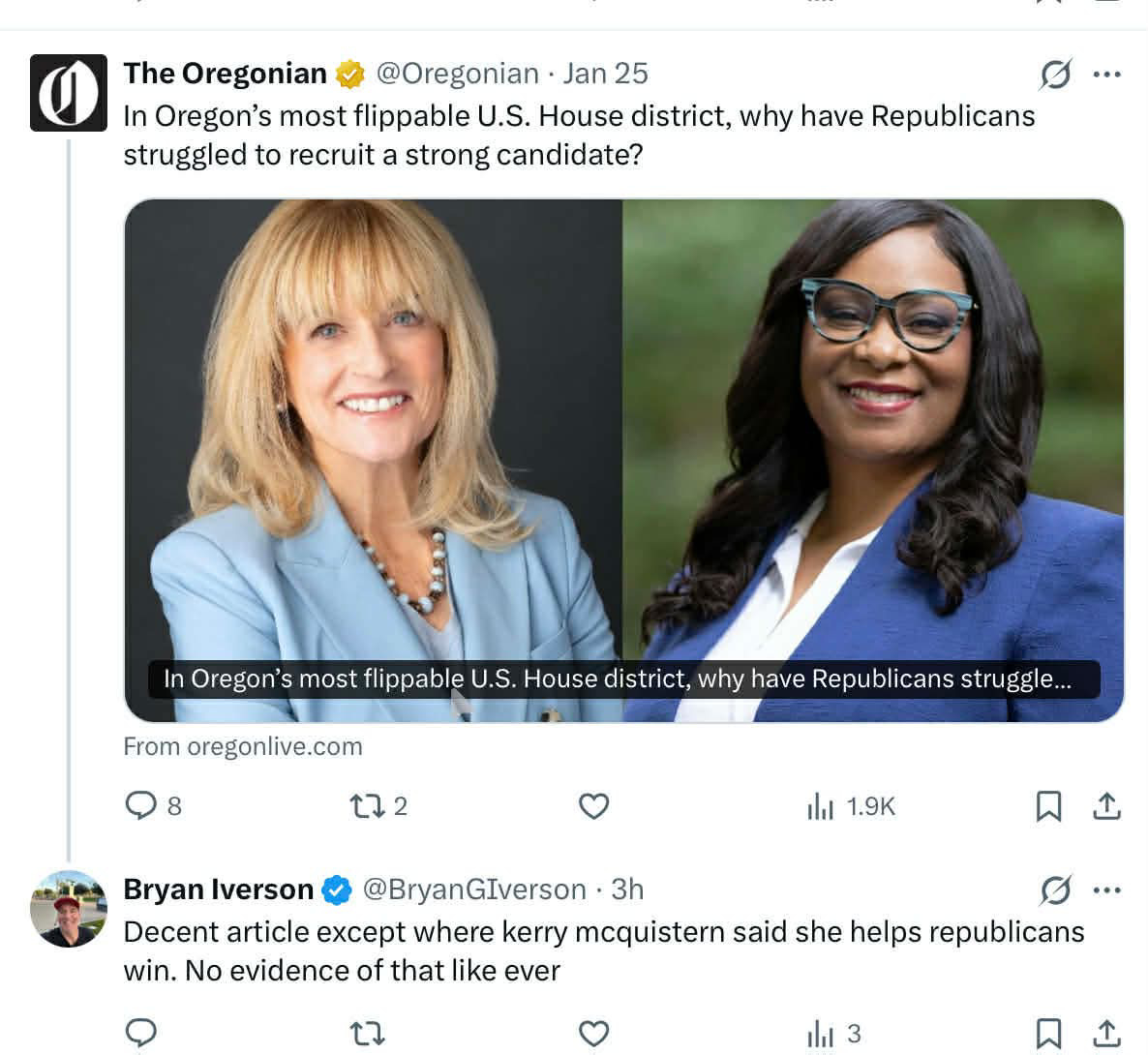 CrosstabsWill Dudley Stand Tall Enough?1×0:00Current time: 0:00 / Total time: -37:32-37:32Audio playback is not supported on your browser. Please upgrade.Will Dudley Stand Tall Enough?Bryan and Reagan talk Governor race and Democrat's eating their own before short sessionBryan Iverson and Reagan KnoppJan 27, 2026ShareTranscriptIs the Governor field set?https://oregoncapitalchronicle.com/2026/01/26/chris-dudley-says-he-will-run-for-oregon-governor-growing-gop-field/?emci=effb93ac-8afb-f011-8d4c-0022482d279b&emdi=d93940df-90fb-f011-8d4c-0022482d279b&ceid=435810Diehl with a big donation -Follow bryan on X @realbryangiverson Looking at 2030, Oregon will lose a Congressional seat? Discussion about this episodeCommentsRestacksCrosstabsOregon Republican political advisors Bryan Iverson and Reagan Knopp give listeners an insiders look at Oregon politics.Oregon Republican political advisors Bryan Iverson and Reagan Knopp give listeners an insiders look at Oregon politics.SubscribeListen onSubstack AppApple PodcastsSpotifyYouTube MusicYouTubeOvercastPocket CastsRSS FeedAppears in episodeReagan KnoppBryan IversonRecent EpisodesShort Walkout for Short Session?Jan 24 • Bryan Iverson and Reagan KnoppReplicator, Nerds and Governors RaceJan 20 • Bryan Iverson and Reagan KnoppLeg Days are Now "Straw Polls"Jan 16 • Bryan Iverson and Reagan Knopp2026 Tabby Results, ICE and UngovernableJan 9 • Bryan Iverson and Reagan KnoppTransportation and Tabby AwardsDec 20, 2025 • Bryan Iverson and Reagan KnoppRaces are Taking Shape in OregonDec 11, 2025 • Bryan Iverson and Reagan KnoppDay One with Sen. Christine Drazan Dec 5, 2025 • Bryan Iverson and Reagan Knopp